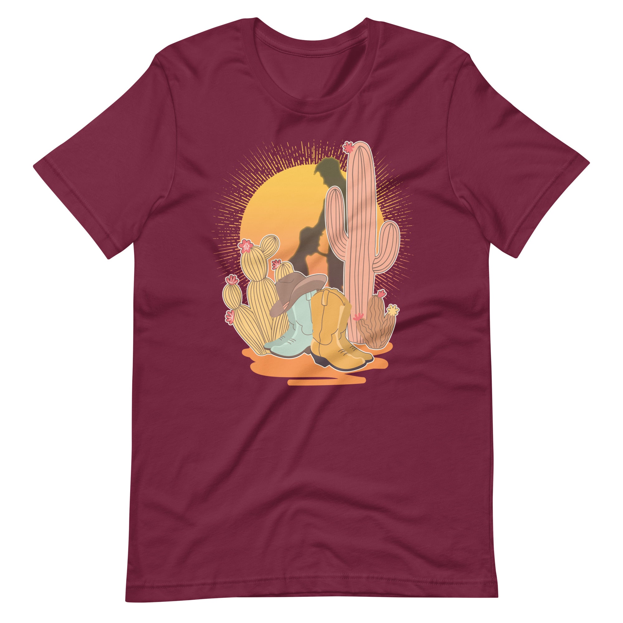 Slip on this shirt and let the spirit of the Wild West ride with you, whether you're heading out to a country music festival, a rodeo, or just a casual day with friends. The soft fabric keeps you comfortable, while the timeless cowboy design adds a touch of romance and pride to any outfit. Show off your love for country boys, the open desert, and that timeless tale of romance under the western sky.