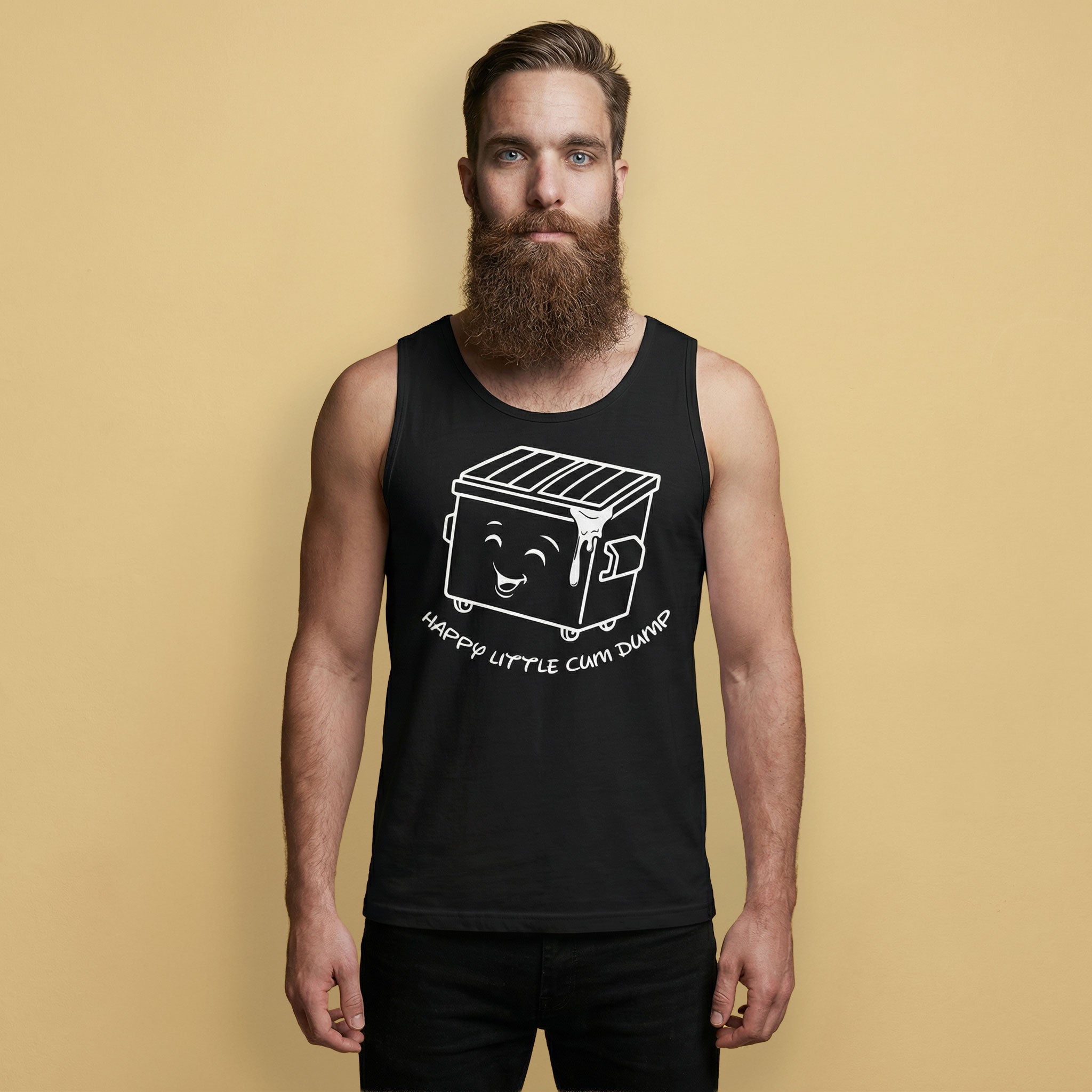 The Happy Little Cum Dump Muscle Tank is loud, shameless, and exactly the kind of humor that earns you drinks before you even open your mouth. Front and center is our cheerful little dumpster — living its best life — while the back keeps a running tally of community participation. No names, no shame… just math.