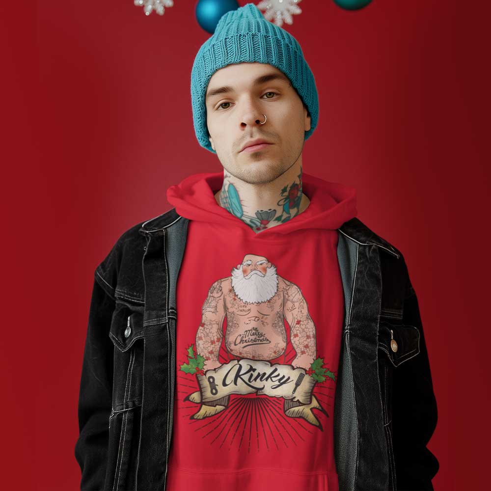 Say hello to the Santa you never knew you needed this Christmas! Our "Kinky Claus" hoodie puts a fun, edgy twist on the holiday classic, with a tattooed Santa showcasing his festive ink and naughty accessories. Perfect for those looking to add a touch of humor (and a hint of kink) to their holiday wardrobe, this hoodie brings all the holiday cheer with a wink and a grin.