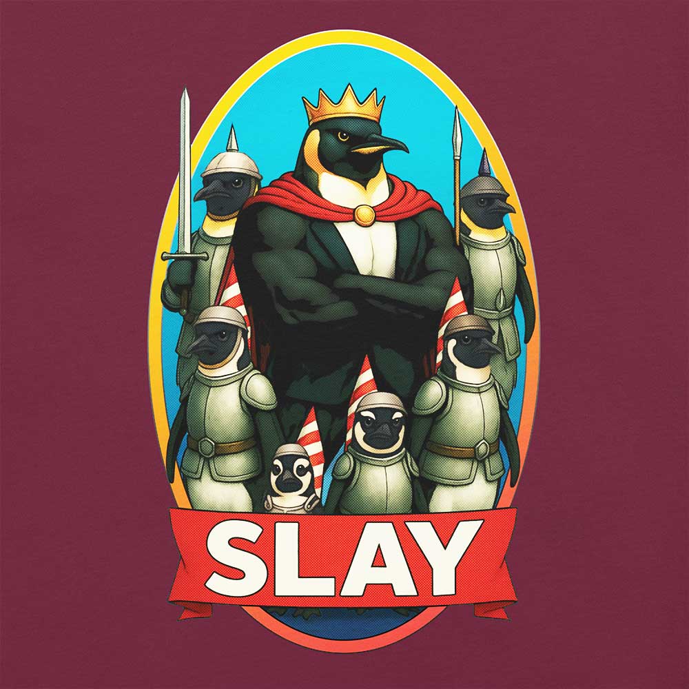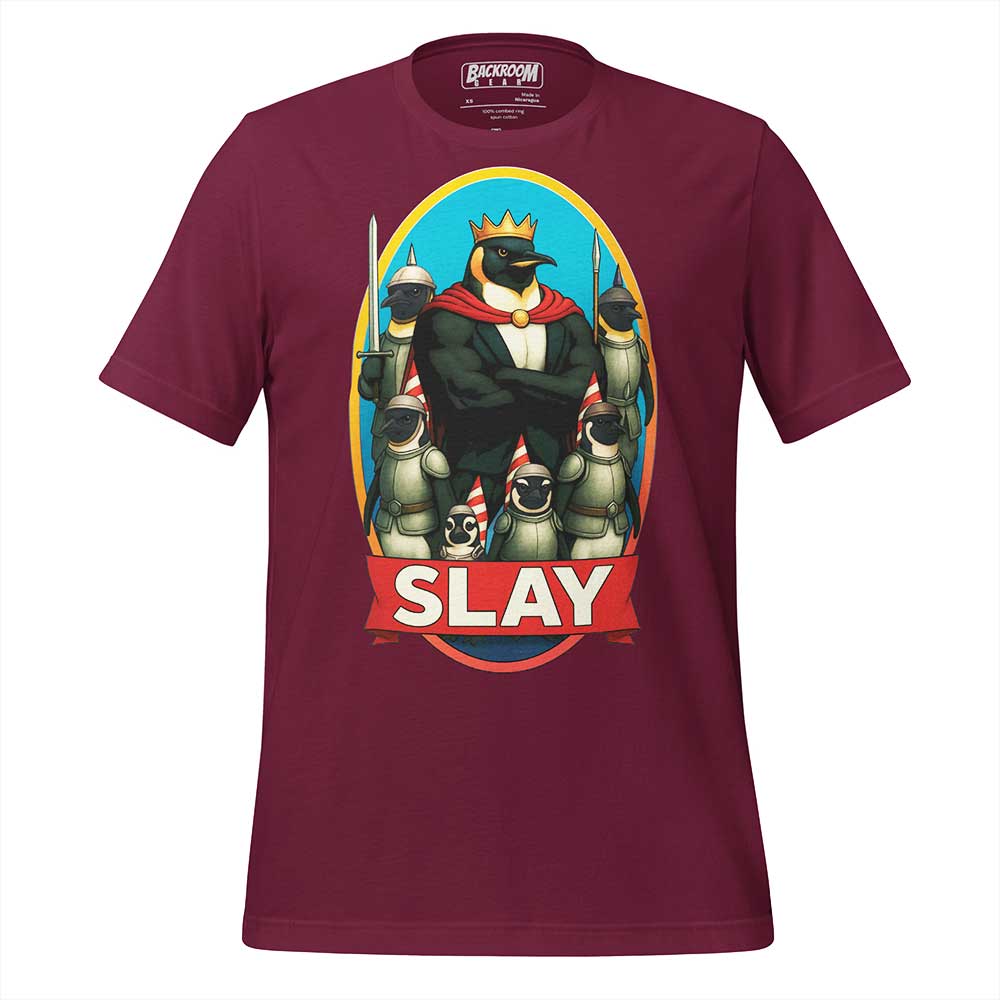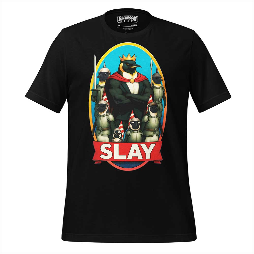 Imagine yourself, shades on, iced coffee in hand, sun glinting off your shimmering “SLAY” tee, chanting from the frontlines while someone screams, “Yas, penguin king!” That’s a moment. This is the shirt.